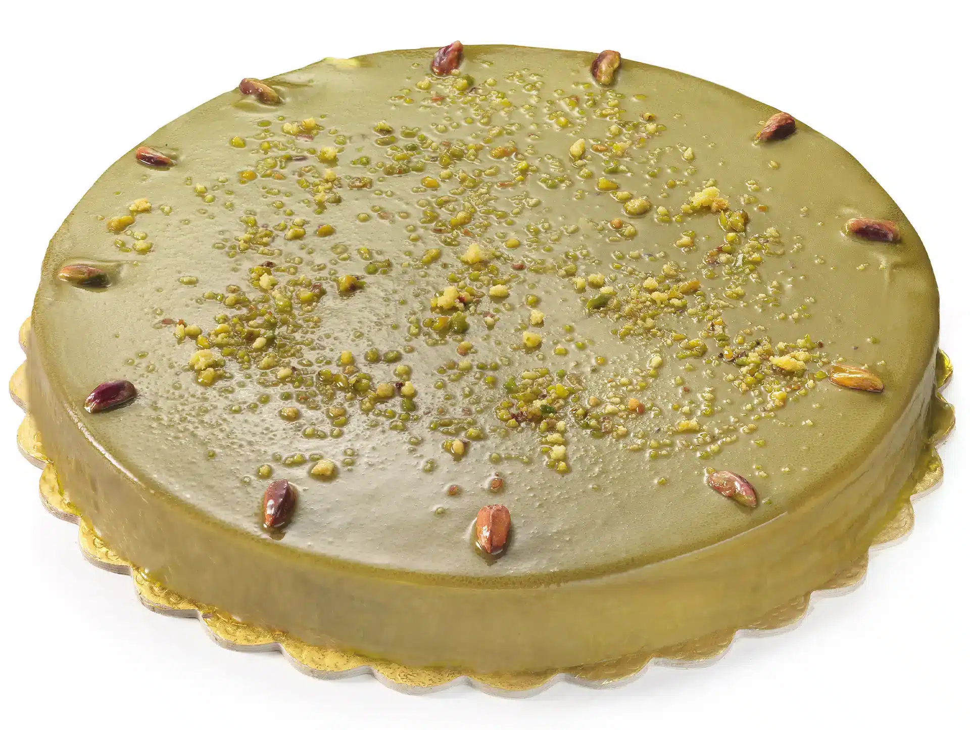 Un biscuit moelleux fourré d'une bavaroise à la pistache, d'un coeur de praliné blanc et de chocolat noir, le tout recouvert d'un glaçage à la pistache.
